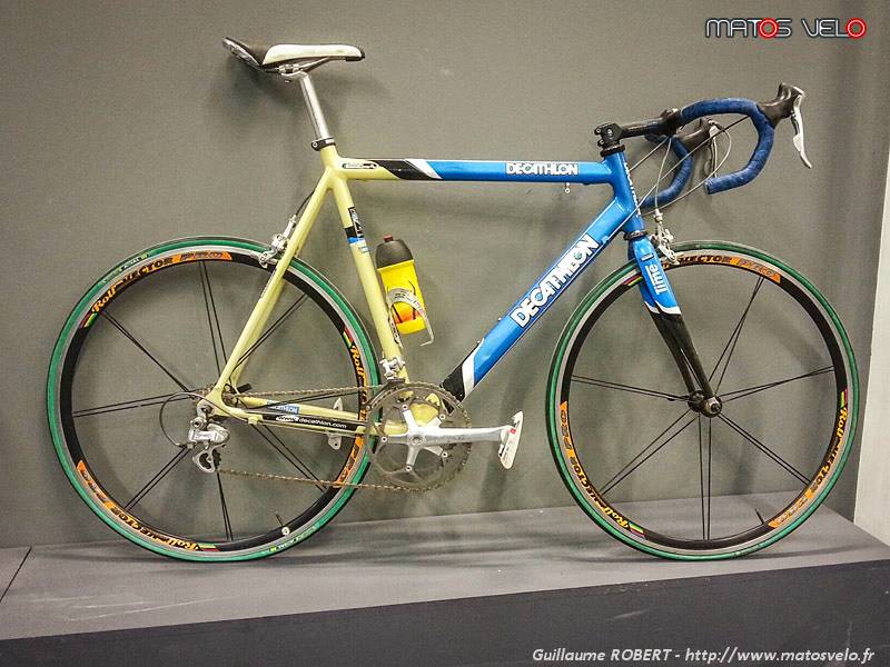 Au détour d'une allée, on tombe sur quelques vélos Decathlon, du temps où la marque équipait les coureurs de l'équipe AG2R. Ici, il s'agit d'un vélo ayant appartenu à Christophe Agnolutto. Roues Rolf Vector, Shimano Dura Ace 9V (j'ai encore les mêmes poignées de freins). Du matériel qui en ferait rire plus d'un. Mais à l'époque, ce vélo alu, qui devait avoisiner les 8.5kg, faisait partie des bons vélos chez les pros et ne les empêchait pas de grimper des cols à des vitesses que bien peu d'amateurs peuvent se permettre.