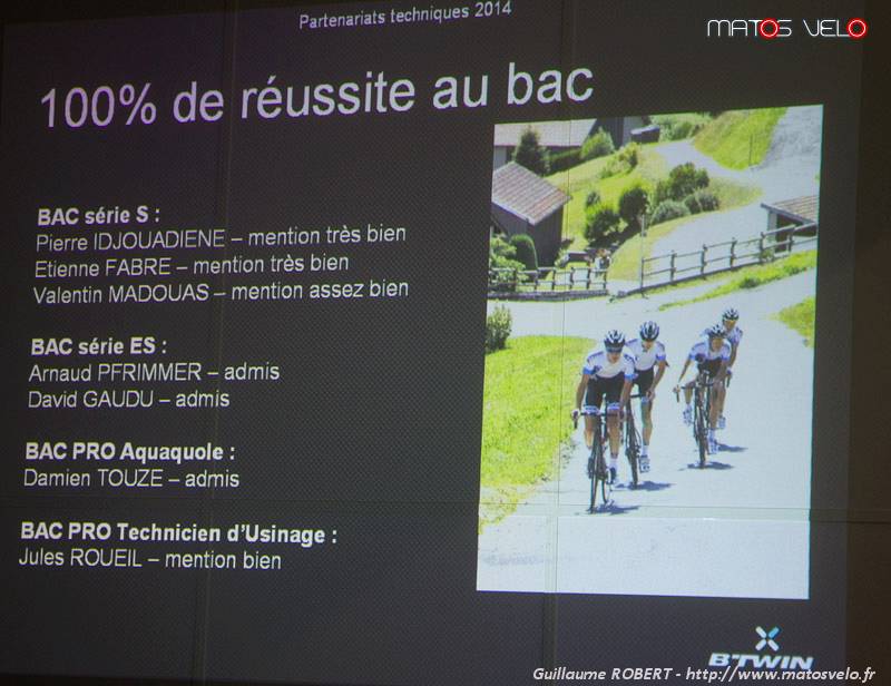 Preuve que le suivi éducatif n'est pas un vain mot au sein de cette équipe, B'Twin affiche fièrement les 100% de réussite au Bac des coureurs 2014.