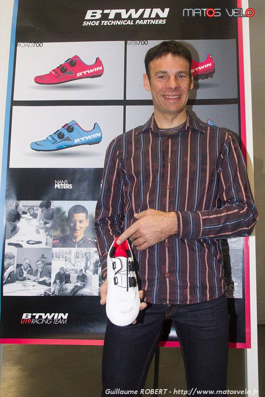 Jean Christophe Péraud était partenaire avec Mavic et a donc fait le choix, pour les années 2015 et 2016, de porter des chaussures B'Twin. Il portera donc le modèle 700 (bleu, rose ?) et apportera son expertise pour améliorer le produit.