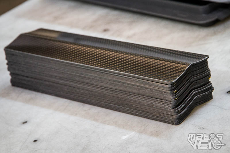 Tout d'abord la vérification du gabarit de la plaque puis ensuite la découpe dans une machine spécifique. De chaque plaque de carbone sortiront 10 lames Blade. Ensuite, chaque lame sera travaillée pour la "polir" et éviter que des échardes de carbone ne dépassent.