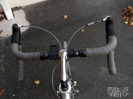 Chez Campagnolo, toute la câblerie passe sous le ruban de cintre, chez Shimano, on a deux câbles ceux pour les dérailleurs) qui sortent sur le côté des leviers. Il faudra attendre la série 7900 du Dura Ace en 2008 pour avoir enfin des câbles de dérailleurs passant sous le ruban de cintre !