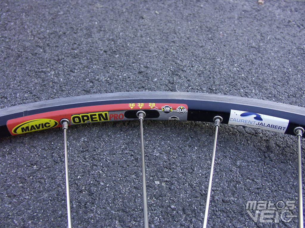 J'avais opté pour une valeur sûre à l'époque, des Mavic Open PRO SUP à 32 rayons. Une jante toujours au catalogue de Mavic ici. Une jante plate (20mm environ) de 430g environ.