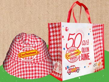 Le mythique bob, célèbre cadeau Cochonou distribué sur le bord des routes pendant les 3 semaines, est en coton recyclé. Tout comme le sac cabas aux couleurs de la marque qui sera en matière recyclée.
