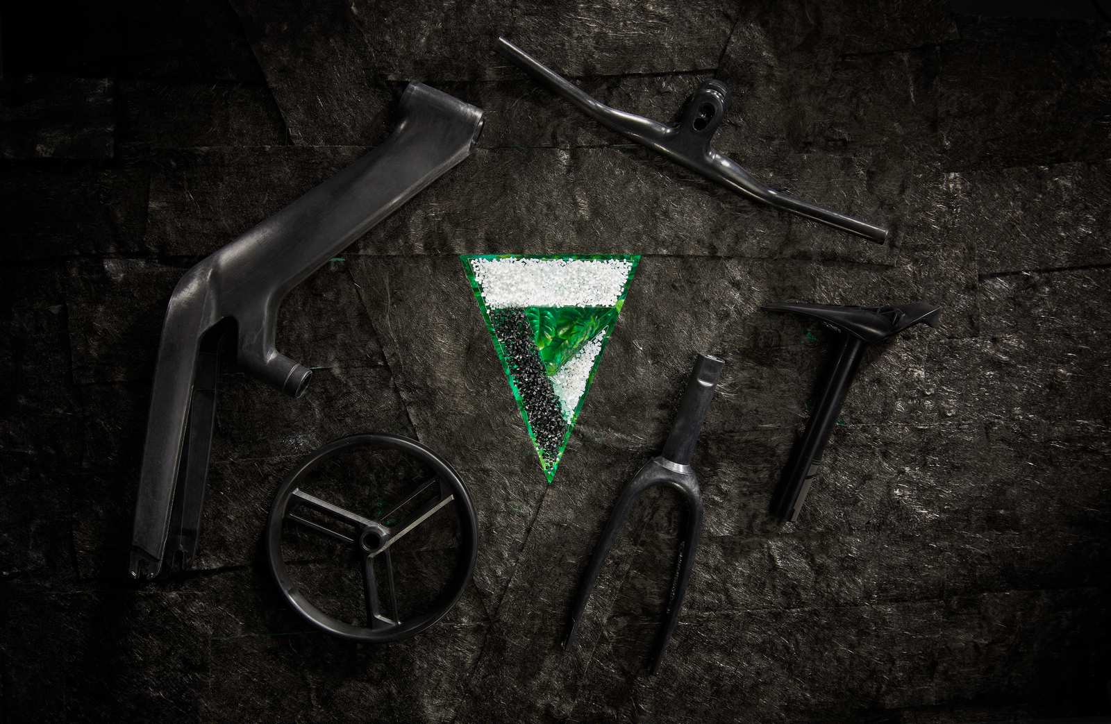 performances des meilleurs composites. Cadre, fourche, pneus, poignées, roues et selle sont fabriqués à partir de déchets industriels et de matériaux récupérés dans l'environnement.