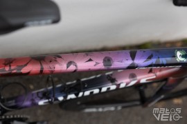 Une peinture très fleurie et aux coloris violets / rouges / roses / bleus qui a le bon goût de ne pas tomber dans les clichés "féminins" des vélos roses.