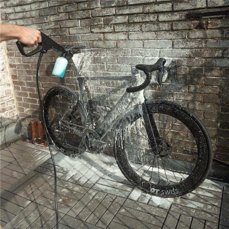 Pour un résultat optimal, vous pouvez ajouter la bouteille à mousse et recouvrir votre vélo en un rien de temps d’une épaisse couche de mousse. Tous les accessoires fournis se rangent facilement dans le réservoir d’eau.